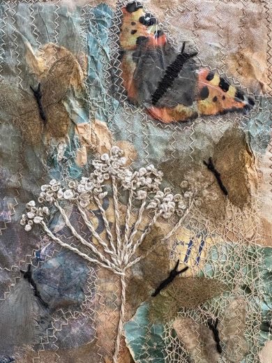 In this workshop you will make a 10×6 inch sample using different mixed media techniques. You will experiment with screwed up paper to make your collage background which you can hide words and images in. You will make a realistic butterfly for your sample by using the packing tape transfer technique. You will also use tea bag paper to be able to transfer in hand sewing flowers, cow parsley or an image of your choice (tutor also has a folder of patterns you can use) and to finish the sample off you can include 3D butterflies.