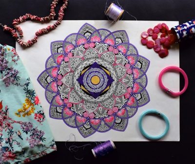 ‘Mandala’ means circle in Sanskrit represent the circle of life. They are created for meditation and contemplation in many sacred traditions. Depicting patterns, nature and even mythical creatures within the ever-decreasing circles leading to Nirvana at the centre. We will use a grid method to create our own symbolic art mandalas in black pen, coloured with watercolour and metallic paints.